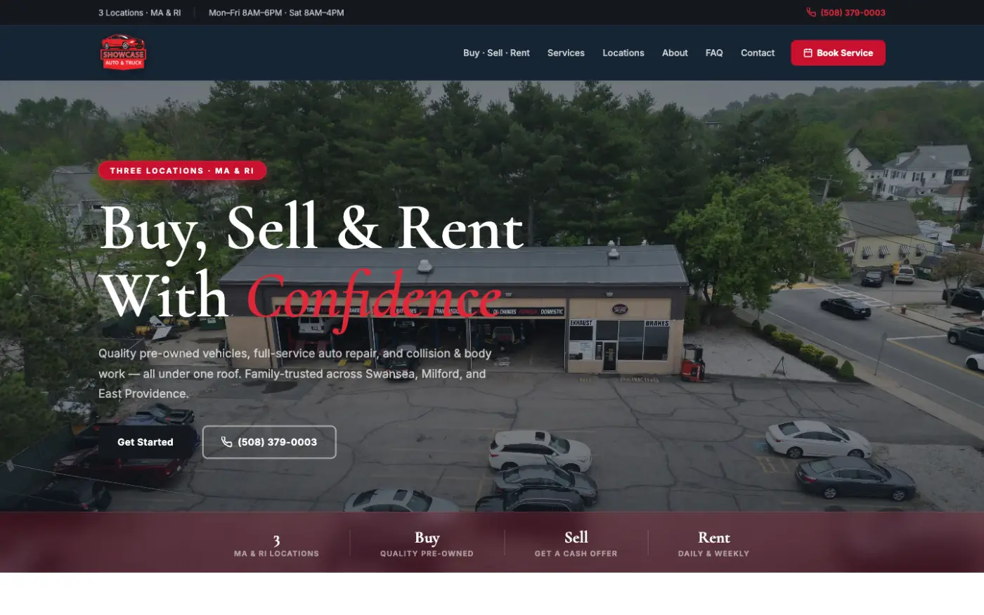 A full marketing website for a multi-location dealership — vehicle inventory, buy/sell/rent services, full-service auto repair and collision across Swansea MA, Milford MA, and East Providence RI.