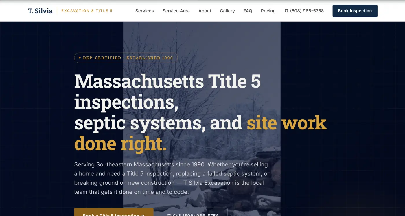 Job management, Title 5 inspection workflow with MA state form population, automated BOH filing, PDF generation with digital signature, and customer/agent portals.